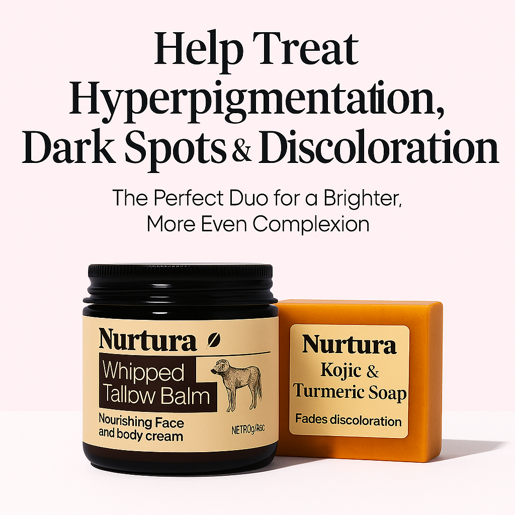 Damaged skin can’t fade dark spots. Our halal tallow balm restores your barrier, while Kojic and Turmeric Soap lighten discoloration for smoother, even-toned skin.