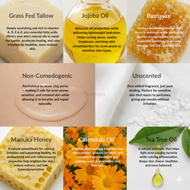 Our halal beef tallow balm is perfect for sensitive hyper pigmented skin, also offering deep hydration, acne relief, and natural radiance—all with pure, ethical ingredients aligned with your value
